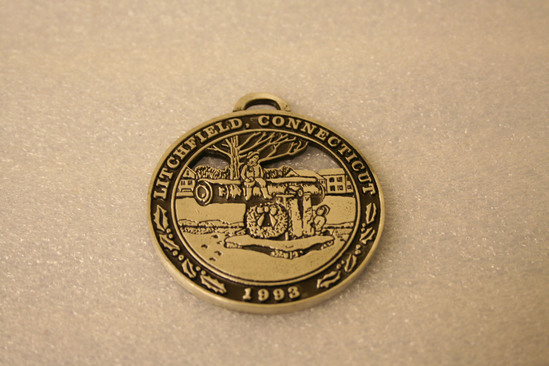 Pewter Christmas ornament. Flat circle with engraved and cut out image of two children on the canon memorial on the Litchfield Green. Around the outside "Litchfield, Connecticut/1993" Commisioned by the Litchfield Recreation Department from Woodbury Pewter as an annual fundraiser.