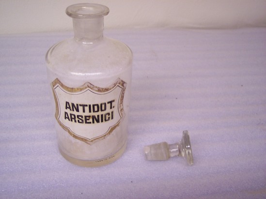Glass apothecary bottle with stopper - lable in shield form, painted on glass, black on white with gilt border "Antidot/Arsenic" a: bottle b: stopper Remnants of white powder in bottle
