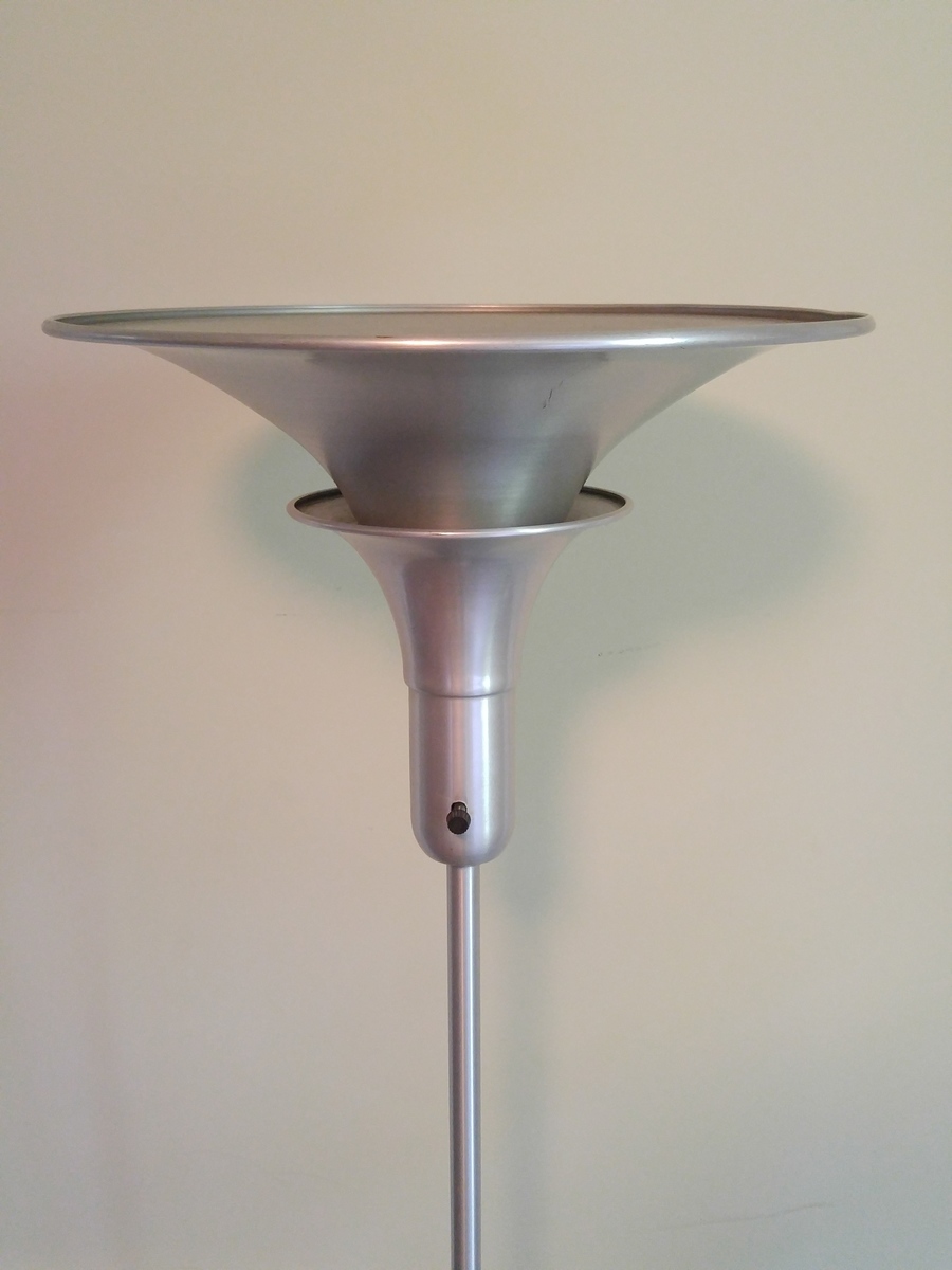 Anodized aluminum floor lamp made by the Warren McArthur Corporation. Circular base with tubular aluminum upright terminating in a flared aluminum top consisting of a narrow section with a light socket and a larger flared aluminum dish on top.