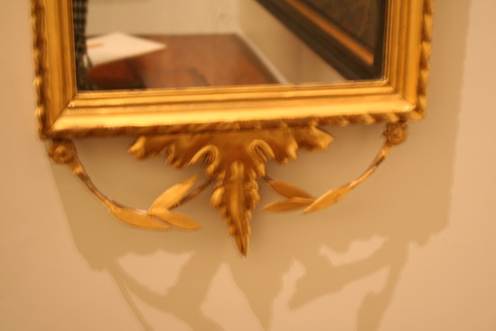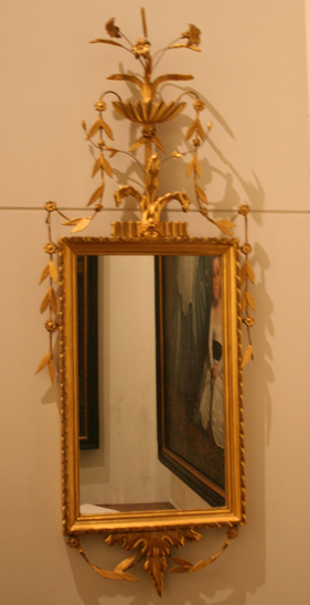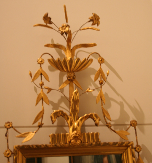 Wooden frame - gilt. Elaborate decoration around outside of frame. At top fleur de lis - behind it a scalloped bowl with three flowers coming out of each side of bowl and traveling down sides of mirror - leaves and flower buds on vines. Bottom has irregular shaped piece at center - upside down flame - with leaves and flowers extending in an arch from bottom corners of frame to center piece.