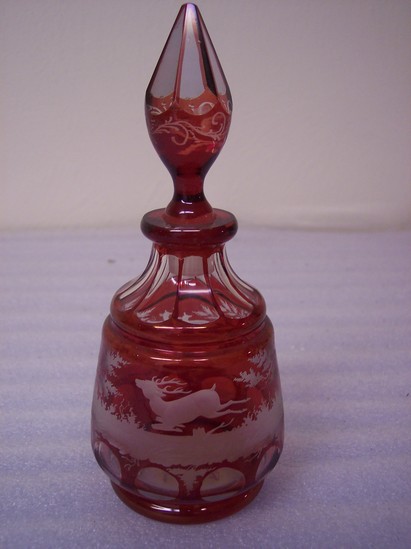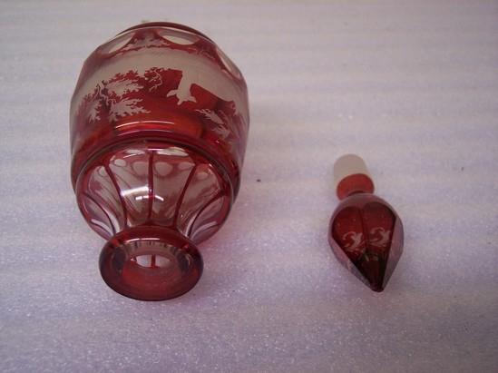 Bohemian red glass with etched designs. Base has pontil mark, flashed red on white, ring base, tapered barrel body, ring shoulder with 10 clear panels sloping to ring neck, flat top, slops round base frosted concave stem, flared to 6 paneled clear pointed slopes with rococo tracery etched through neck. Decoration on sides: 10 clear circles below frosted scene of grass and trees with seated doe and jumping buck on opposite side. Used in Henry Ward Beecher family