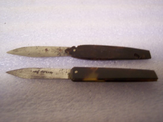 two steel lancets with tortoise shell handles. One blade stamped "Tiemann". Used for bleeding.