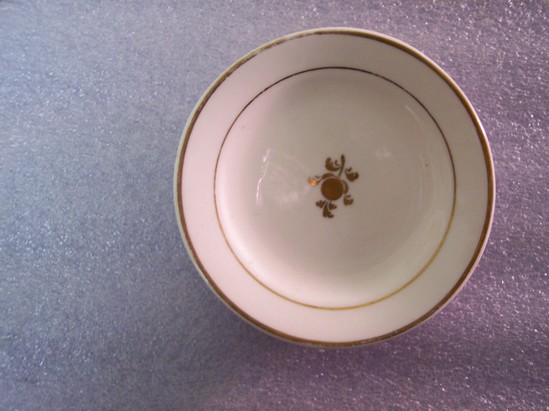 Small, white round plate with gilt line rim and inner circle. Small, gilt floral spray in the center of the plate. Wide foot rim.