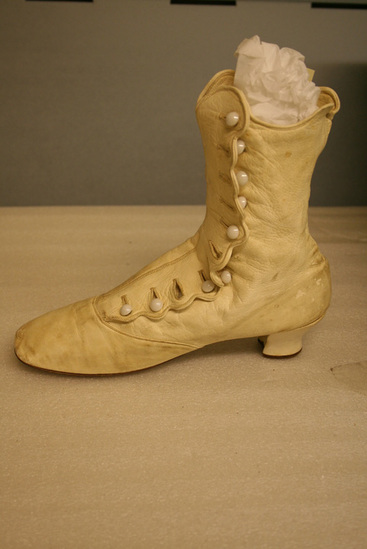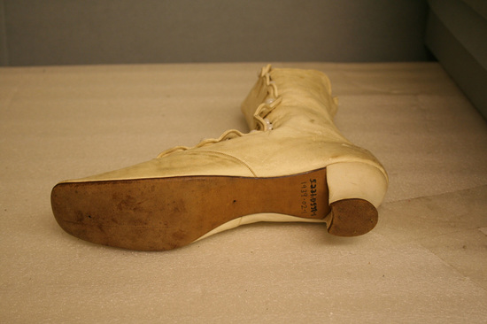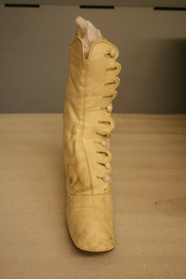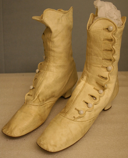 White kid leather boots; tall - coming to mid calf on leg; button up sides with white glass buttons; scalloped trim on button edge and at top of boot; 1" heel; rounded toe; brown leather shoes