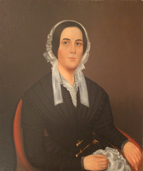 Oil on canvas portrait of Hannah Griswold Peters attributed to Ammi Phillips, in reproduction frame. Woman faces right and is seated in a red chair, wearing a lace bonnet and black dress with lace collar. She holds a piece of lace in her lap and part of a pocket watch with ornate clock key fob is visible.