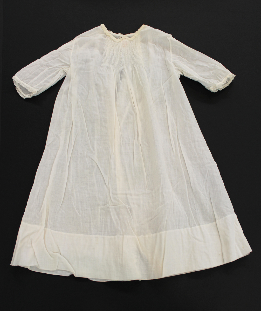White sheer cotton christening dress; long sleeves with lace cuffs; lace collar; round neck with lace ruffle; vertical tucks at neck form gathers; center back opening with five mother-of-pearl buttons; white label with orange lettering at left center back: "Hand Made / IMPORTED" with crest