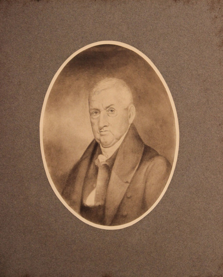 Black and white photographic print (possibly a salt print) of a portrait of Phineas Smith. Image looks to be of an original portrait, but there is no indication of what medium the original artwork was executed in. Some pencil sketching has been added over top of the print on the face and around the body of the subject. The oval shaped print is mounted on a 10" x 12" piece of gray mat board.