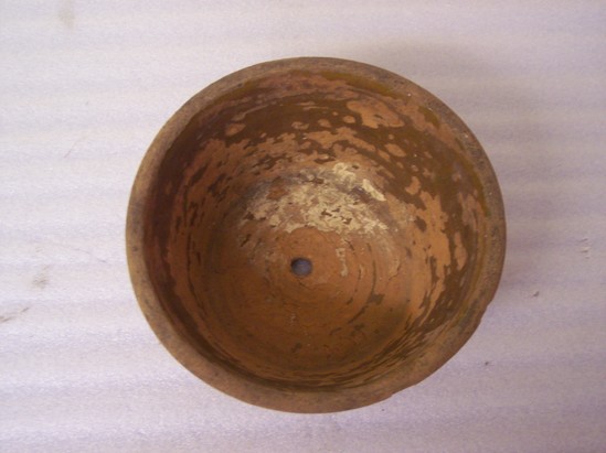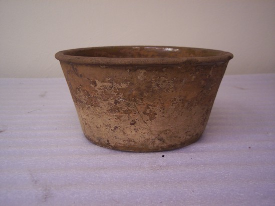CLEAR GLAZED INTERIOR, UNGLAZED EXTERIOR. ROLLED RIM, PLAIN BASE.