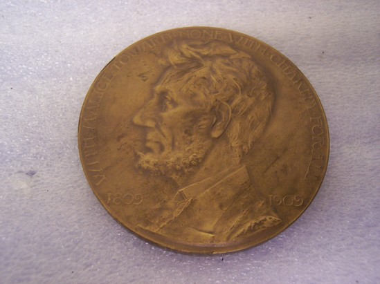 G.A.R. medal. Front side has a relief profile of the beaded Lincoln with dates 1809 and 1909 on either side of shoulders and the quote "With Malice Toward Non, With Charity for All" printed around edge. Back side has a border of wreath made up of a branch of oak leaves on right side and branch of olive on left surrounding legend "This Medal was struck for the Grand Army of the Republic in Commemoration of the 100th Anniversary of the Birth of Abraham Lincoln"