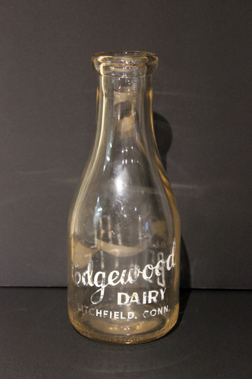 Clear glass, one quart milk bottle. Bottle has wide base that tapers to a short neck with a thick rim. Bottle printed in white on one side, "Edgewood/ Dairy/ LITCHFIELD. CONN." Other side printed in white, "STORE/ BOTTLE". Impressed into glass around rim of base, "2066 REGISTERED SEALED UGP51 A ONE QUART LIQUID".