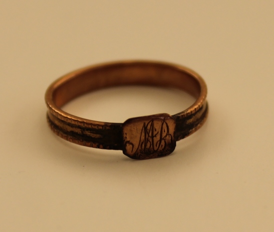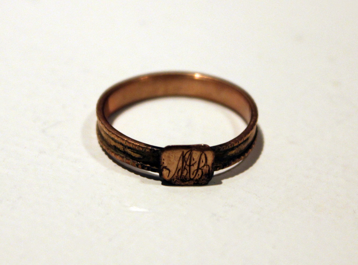 Round ring with chipped edges and smooth interior to hold woven hair, square gold bezel with "MB" on it and space to tie hair underneath. Ring once owned by Clarissa Perkins. "M.B." Mary Brainerd of East Haddam Ct. died young, friend of Mrs. Asa Bacon