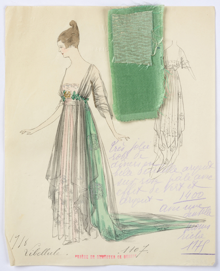 Lithograph and watercolor on paper fashion design. Dinner dress in silver lace on pale rose with a touch of green and silver. Fabric samples accompany rendering.