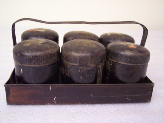 Japanned tray with six spice canisters. Tray has two handles; canisters have tops. Canisters contain spices; at one time had labels. Cannisters are round, cylindrical shape with domed caps.