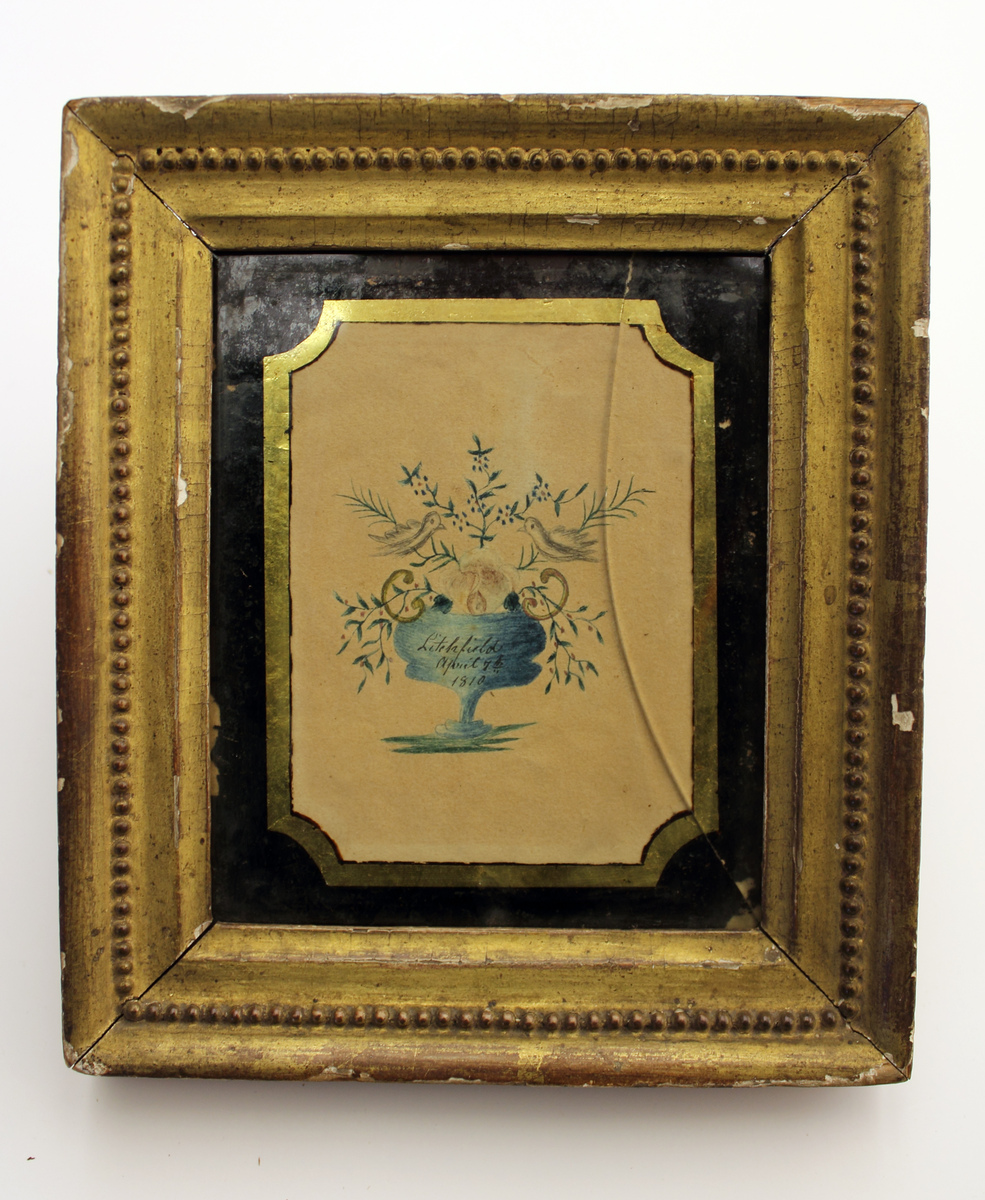 Watercolor and ink drawing of an urn with florals and birds. Bowl-shaped urn with narrow neck, two c-scroll handles in gold, and a small, round base; urn completed in shades of blue. A white flower sits at the center of the urn, with green branches extended outward; red buds or berries on some of the branches. Two white and grey birds are perched on the branches, facing inward. Written in ink at the center of the urn, "Litchfield/April 7th/ 1810." Paper sits under a reverse painted eglomise with black and gold border. Framed in a giltwood frame with beaded decoration. Frame and eglomise appear period to the watercolor. Bare wood on frame reverse; the work is held in the frame by a wood backing, with paper lining.
