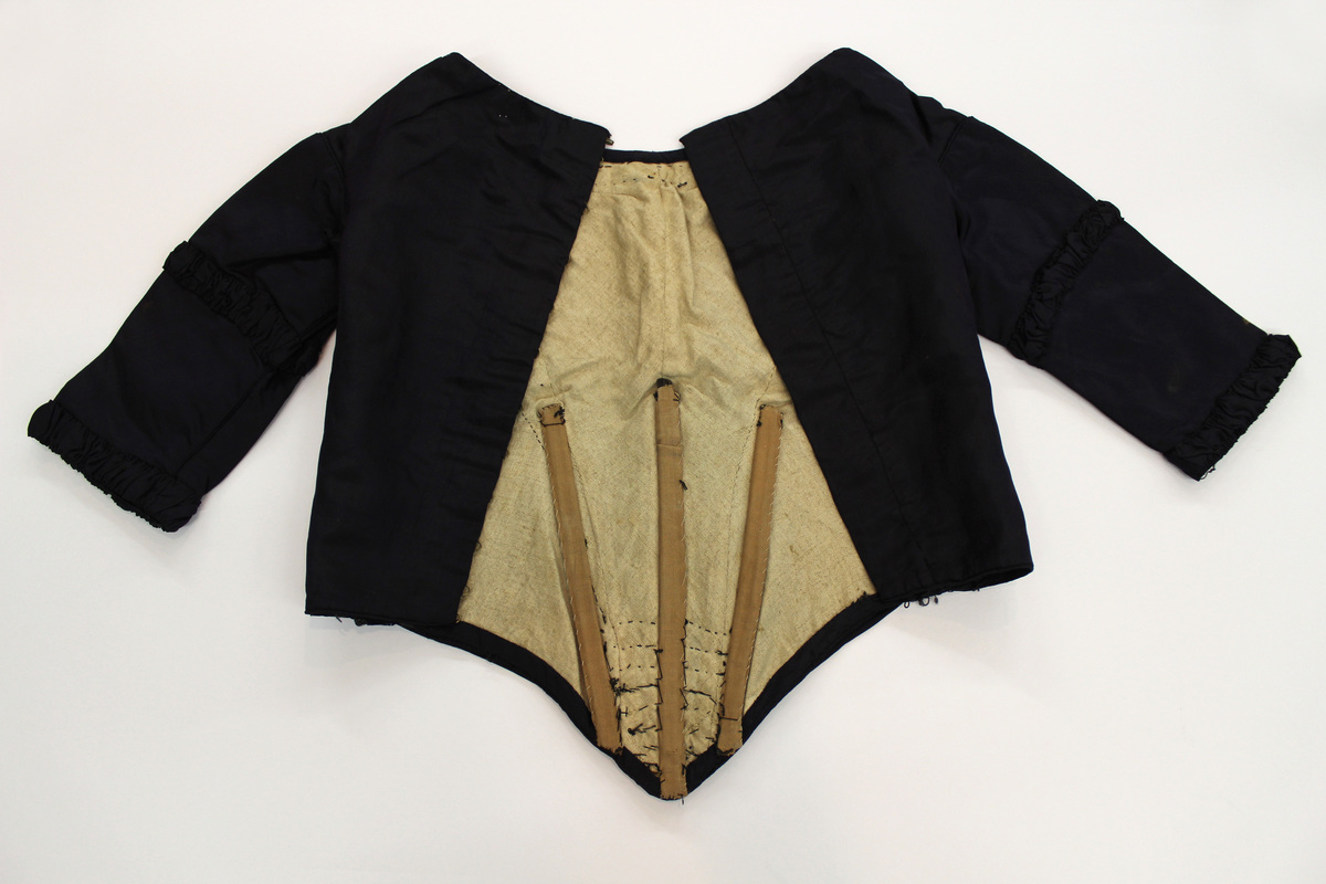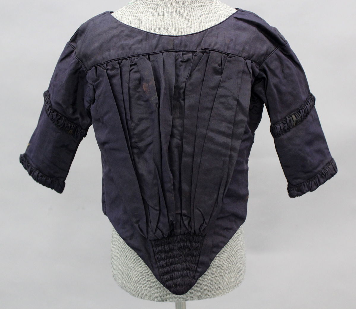 Dark purple girl's bodice; boat neck; three-quarter length sleeves with ruching halfway down and at cuffs; front panel gathered into a low pointed waist with rows of gathers; piping along neckline, top of sleeves and gathered panel; fastens down center back with 12 hooks and eyes; lined in tan linen; three whalebone stays at center front in linen casings; hand-stitched