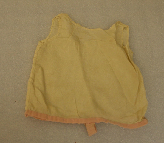 Doll's combination - whiet silk with pink silk binding, rolled hem at neck and arm holes. Bottom bound in pink silk with strap fasteners snapped to back