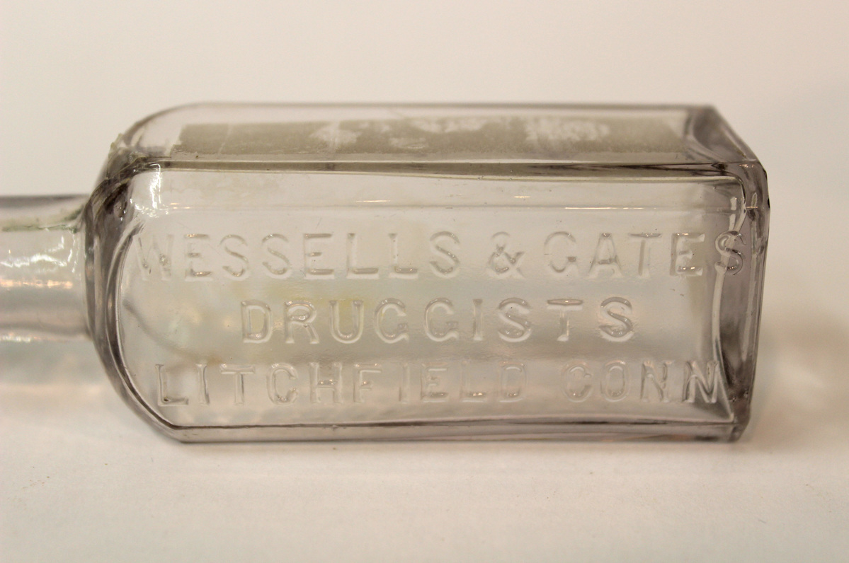 Pressed glass medicine bottle, clear glass, squared shoulders with beveled corners. 1" neck with flat rim; mold lines visible. Embossed lettering on front, "WESSELLS & GATES/DRUGGISTS/LITCHFIELD, CONN." Embossed lettering on bottom, "W.T. & Co./R."