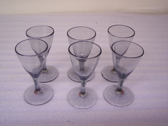 These were bought in 1938 from Knowlton of Mansfield, CT who thought they were Willington, CT glass. If they were he would not have sold them as he collected Willington glass. Several years later a large goblet, same type and color as these wine glasses was purchased from him which was later broken