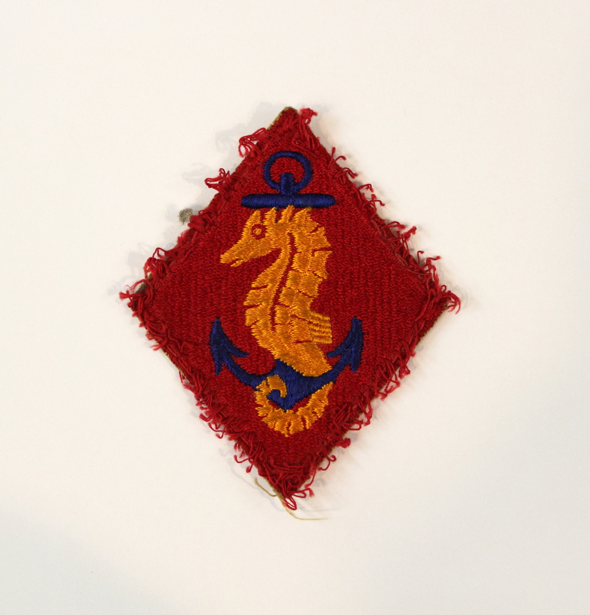Diamond patch, red background. In center large insignia of blue threaded anchor intertwined with yellow threaded seahorse. Sea Duty Qualification Patch, World War II era.