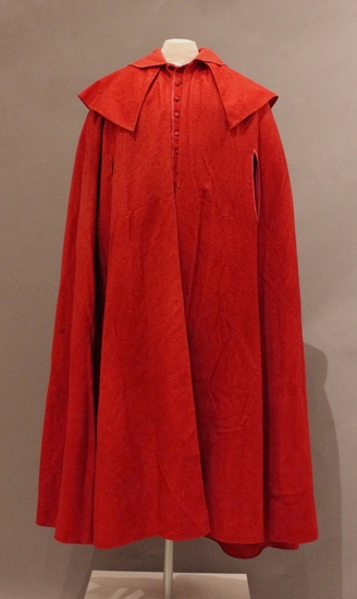 Turkey red light weight wool cloak; collar, short cape around shoulders, no yoke; inverted box pleat center back with six smallish pleats to regular box pleat (1" wide) at shoulders and two pleats thereafter to opening; inside is another piece which is approximately elbow length; closes with eight red linen covered buttons; buttons holes are finished with a gold colored thread and the edge is bound with red linen; hook and eye closure on the outer layer of the hood at the neck; the hem and edge of opening are hemmed; collar edged with linen; tape for hanging back of neck has torn