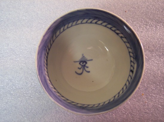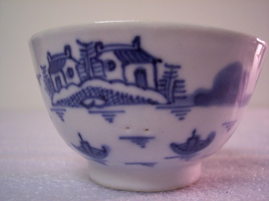 Tea bowl (i.e. handle-less teacup) on a round, footed base with blue-banded rim and an Asian scene of two houses, trees, and birds.