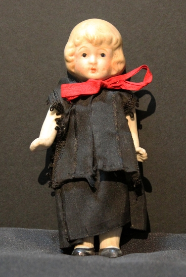 Small bisque, wire jointed doll. Doll has molded, short blonde hair with blue eyes. Doll also has molded and painted black shoes with white sock with blue stripe around top of ankle. Doll wears black satin dress that ties at neck with a red ribbon.