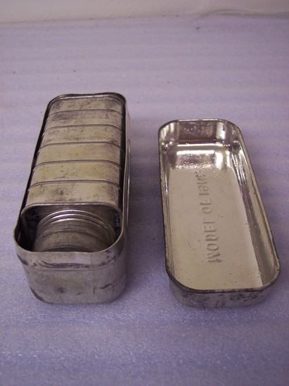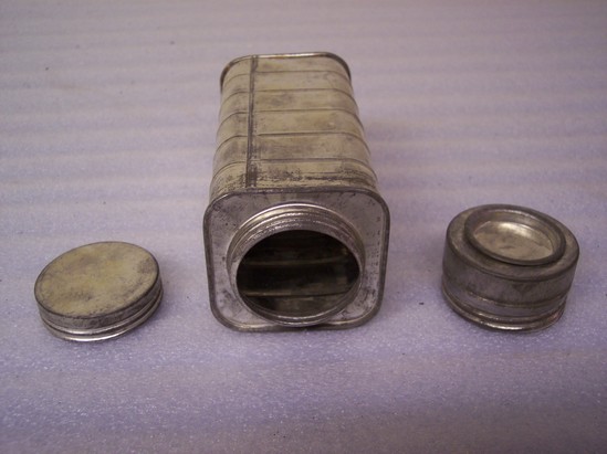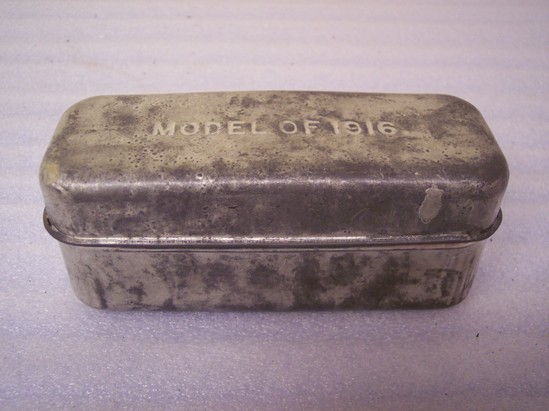 Rectangular aluminum box. Lid impressed with "Model of 1916" on top. Inside box is rectangular shaped container, ribbed body. Cap on each end. Two compartments in container - possibly for holding liquids