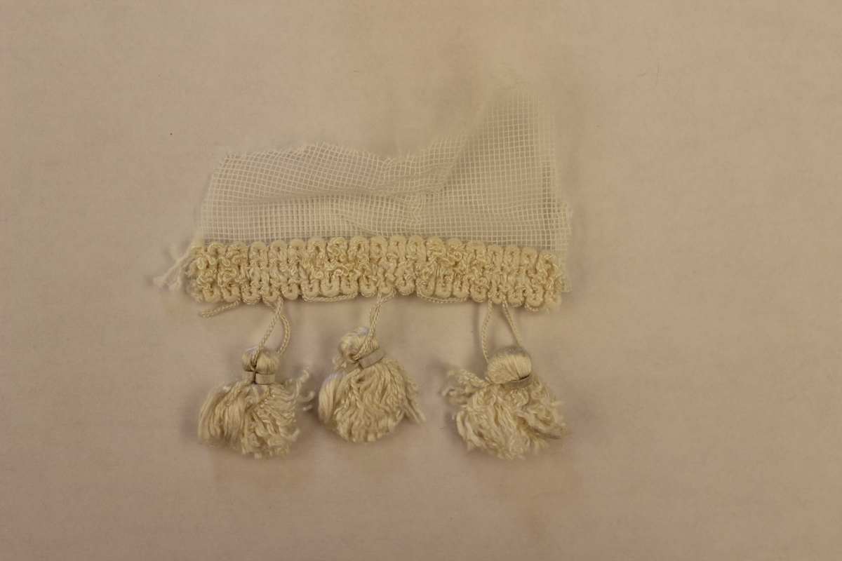 Three silk tassels attached ti a woven strip made of a wave-shaped design stitched through the middle horizontally. White netting sewn to the back of the strip and extends above it. The netting, strip and tassel are all white.