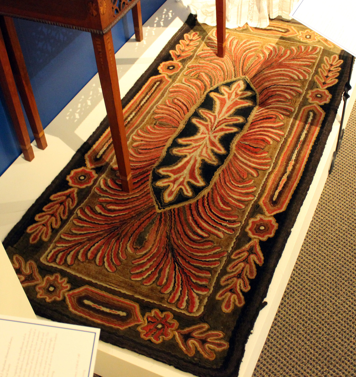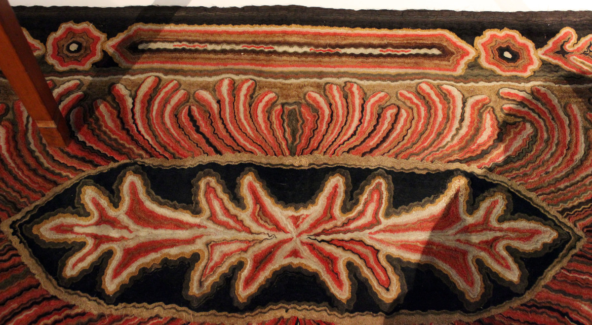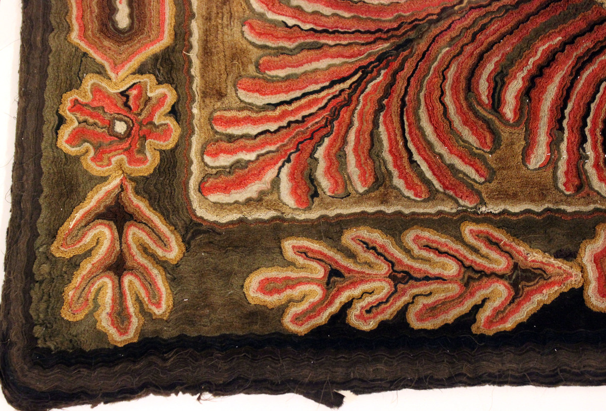 Cut work wool rug. Center medallion of two oak leaves on elongated black rectangle surroounded by feather design on dark gold field. Dark border with elongated rectangles, flowers, and oak leaves. Designs worked in reds (beet dye), golds, and black.