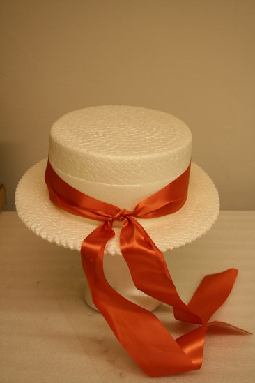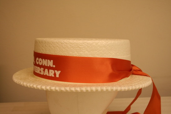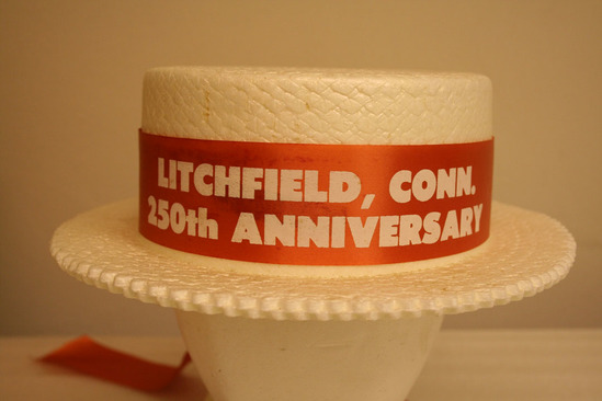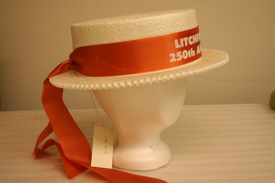 Oval hat made of white Styrofoam; flat even brim; oval crown with flat top and straight sides; red ribbon around base of crown with long tails in back; in white print "Litchfield, Conn/250th Anniversary" on front; label "Pat. Pend./Lewtan Line/801-F/Made in USA"