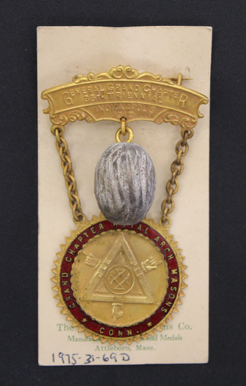 Gold-colored Masonic medal. Oblong bar with scroll decoration at top. "GENERAL GRAND CHAPTER / 35TH TRIENNIAL / INDIANAPOLIS / 1912" stamped across bar. Wooden nutmeg hangs below center of top bar. Gold chain extending down from each side of bar to hang a circular pendant. Red enamel border around outer edge of pendant. "GRAND CHAPTER ROYAL ARCH MASONS * CONN * in gold. Center of pendant stamped with a triangle with Masonic symbols inside. "THE CHAS M ROBBINS CO / ATTLEBORO MASS" stamped on back of pendant. Medal pined to a cream-colored stiff paper. "THE CHARLES M. ROBBINS CO. / Manufacturers of badges and Medals / Attleboro, Mass." printed across bottom in green.