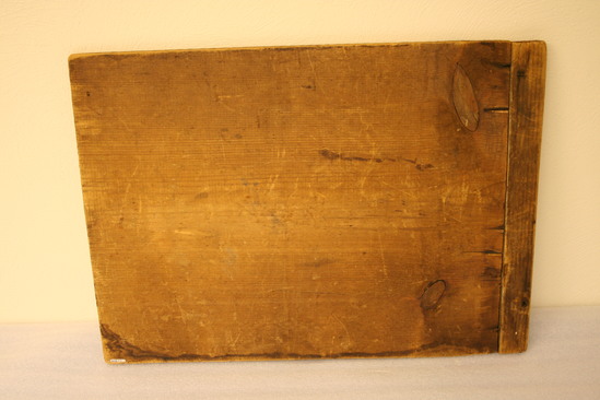 Wood sign made up of two boards nailed together at the seam. Wood rough, unpainted. Writing on front in black paint "From Hfa Ins. Co./Ch'ges Paid/Chas. B. Bishop/Litchfield/Conn/Agent"
