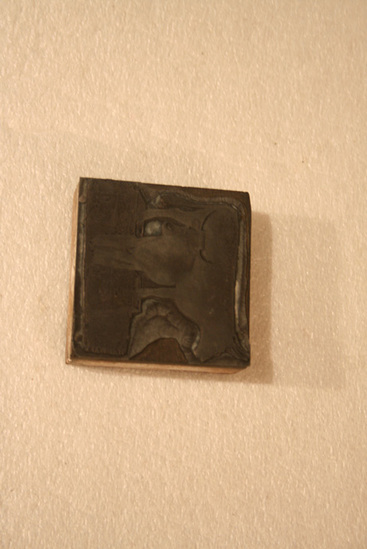 Stamp with wooden block base; raised stamp on one side of two steer. One standing on two blocks and the other standing underneath the first cow. Stamp made of rubber like material; nailed to wooden block. Back side of block has piece of paper partially glued to block with imprint of stamp in blue ink