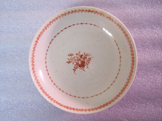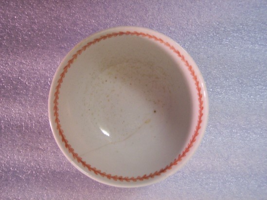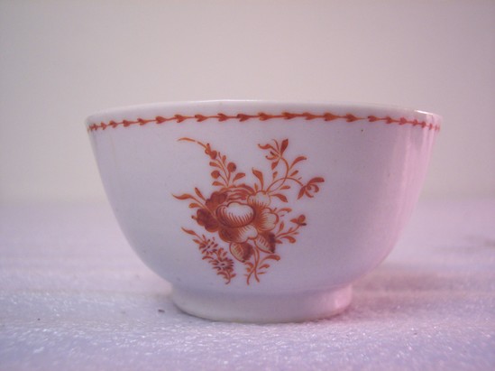 Handle-less cup with flared, round sides. Decoration in orange, one large spray of flowers and leaves. Saucer white porcelain with matching floral spray.