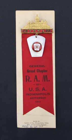 Three part Masonic pin. Gold oblong bar at top with image of a city on top. Red enamel on bar with "IOWA" in gold across it. Red silk ribbon hanging from bar. 'GENERAL / Grand Chapter / R.A.M. / -- OF -- / U.S.A. / INDIANAPOLIS / SEPTEMBER / 1912" stamped in black on ribbon. Shield-shaped mother of pearl pendant hanging in front of ribbon. Circular, red enamel piece set on center of mother of pearl shield. White enamel shield within circle with "K.S.M.T.K.S.S T." in gold. Pin on cream-colored, stiff card stock with "MADE BY / LOWE & CO., MUSCATINE, IOWA / Mfrs. of Convention Badges" printed in black at bottom.