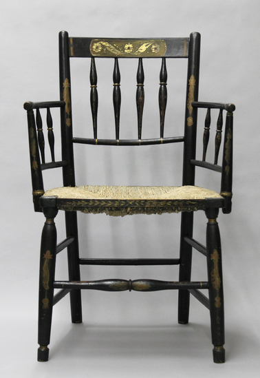 Wooden Sheraton style arm chair painted black with gold painted decoration on legs, stretchers, and slats. Rush seat. Chair has double stretchers on sides, single stretcher in back, and single stretcher in front. Back of chair composed of two horizontal slats with painted decorations. Four turned vertical slats between horizontal ones. Chair has a seat cover over rush seat. Cover backed in green silk. Woven wool top with floral needlepoint decoration. Embellished with beads.