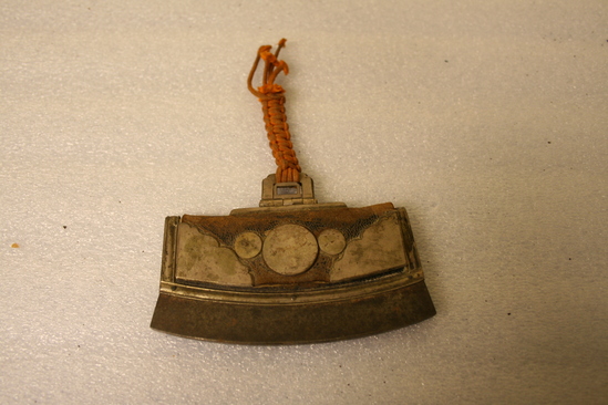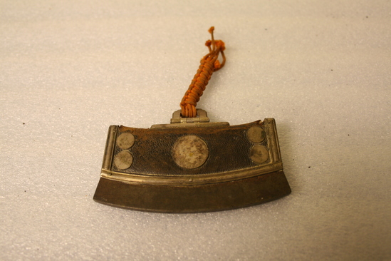 Shallow leather patch with steel frame. Bottom of frame has steel bar attached. Flap of pouch has metal corner. Metal ring at top with orange string braided through it. Brass plaque on inside of flap with Asian characters printed on it. Called a Chuck Muck in Tibet which means "flint and steel"
