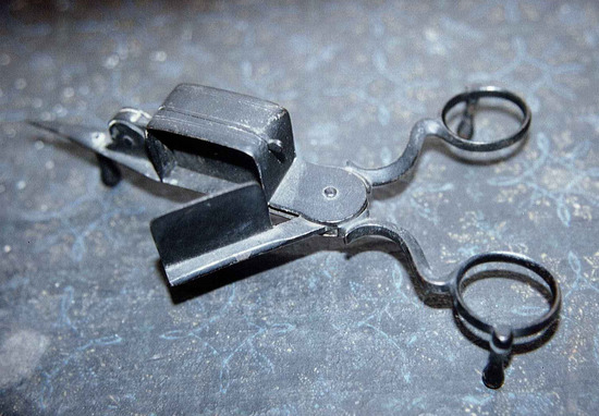 The box on the top is wider than usual. The finder holds remain open. When closed, the clipper moves into the box and a swivel hinge mounted on pointed end controls a narrow section that moves up and down.