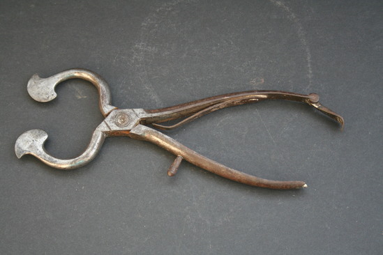Two identical pieces of iron, reversed and hinged in the middle. Above hinge pieces are rounded with flat rounded edge at each end. Thin handles below hinge which bow outward slightly. On end of one side of handle is a hinged clasp which hooks onto elevated metal piece on opposite handle end. Underneath one side of handle is shaped piece of metal that rotates outward from underside of handle.
