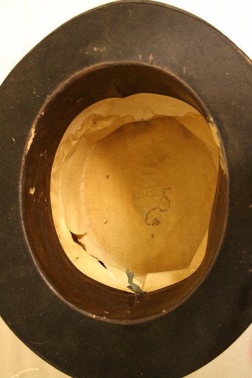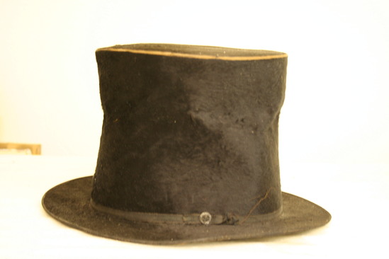 Man's black beaver fur top hat; body of hat has "stove pipe" shape; round brim which encircles entire hat; top of brim beaver fur; bottom (or underside) of brim leather; interior of hat lined in heavy paper; leather band located inside hat near brim; hat was probably the collapsible type of top hat; label "Goodrich & Dix/328 Main St./Hartford, CT" on interior top of hat
