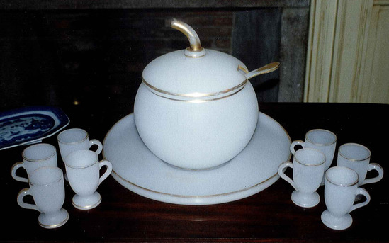 All white frosted glass with gilt trim A - tray 1 1/2" high x 16" diameter, well in bowl, vertical rim with gold, gold dot in center. Bottom edge smooth, top frosted B - bowl 7" high x 8" diameter at top x 5 3/4" diameter at bottom, slight foot rim gilt, top rim gilt, sphere shaped C - Cover, gilt handle and rim, Knotch for ladle - B&C form pumpkin, 5" long x 6" diameter, handle is black D - Ladle, 12 1/2" long - deep round cup with pouring rim to one side - girl rim, long handle with gilt sides and fleur de lis at end E - 8 cups - 4" high x 2 1/4" diameter, flat round base with gilt rim, each handle with gilt, vase cup form with gilt trim