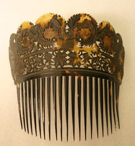 Ornate carved and pierced woman's hair comb. Floral and fern pattern. 21 teeth slightly tapering from center to each side. The fern pattern consists of three pots, one in center and two off set on sides with large training ferns in circular pattern. Center horizontal band of dots with flowers and leaves below.
