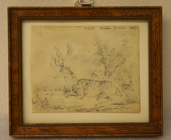 Pencil sketch of an antlered deer lying beside a stream with willows in background. At top of drawing, in ink, "C.B.D. Napoleon Gimbrede 1831." C.B.D. stands for Clarissa Brainerd Deming, a student at the Litchfield Female Academy from 1830-1832.