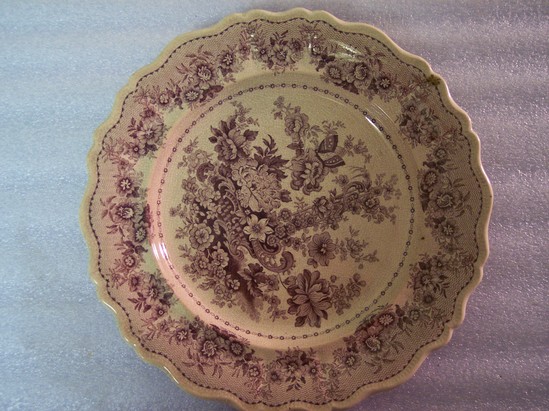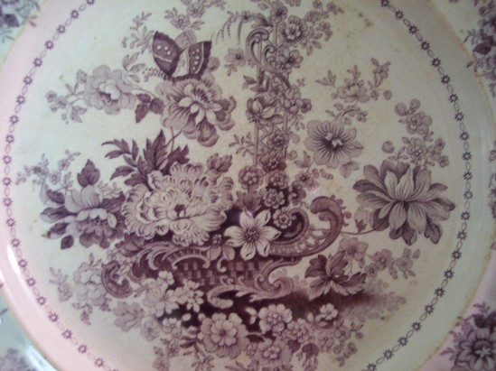 Lobate edge with impressed dot border, manganese transfer-printed design. Wavy lines with floral swags on rim, large fancy rococo vase and flowers with butterfly in center.
