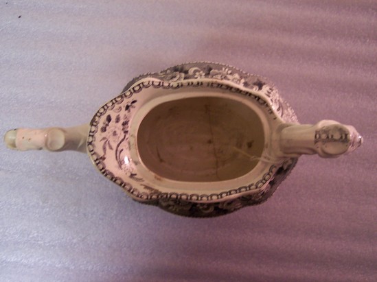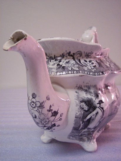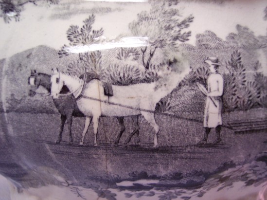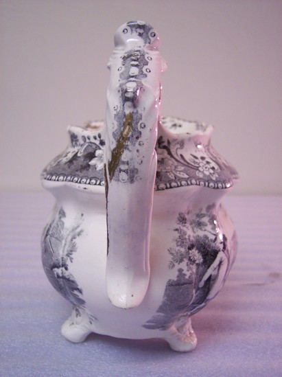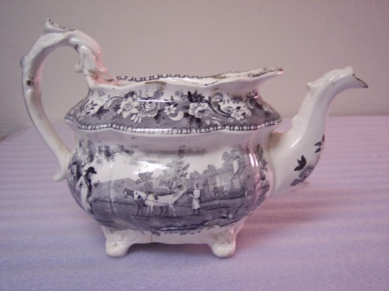Transferware teapot in black and white with agricultural scenes on either side of the base (A). The lid (B) is broken into four pieces. Base rests on four "feet." Decoratively molded handle and spout..