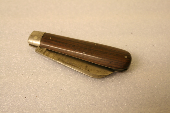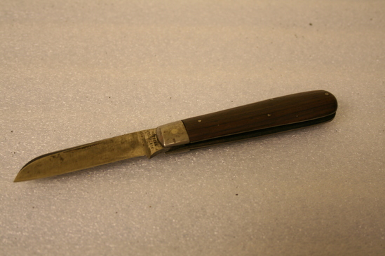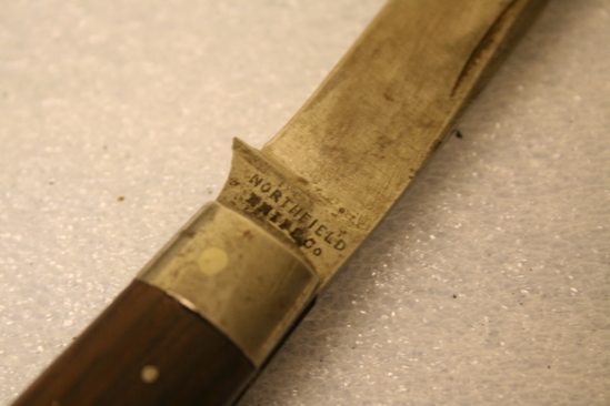 Handle of steel with wood finishing sides - 4 nails; steel tip. Blade wth fingernail groove; markings at base "Northfield Knife Co./Conn". Molded at top as well as sharpened edge