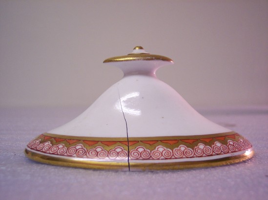 Lid decorated with gold bands and a band with a gold border and red leaf and scroll. Marked "4" on the bottom. Asian inspired design. This is the wedding tea set of Anna Pierce Brace, (Mrs. Charles Loring, married May 6, 1818). Wedgwood #714, "Bittersweet." It was inherited from Mrs. Pennypacher's mother, Mrs. Ruth Loring Whitman; and by her from Mary Hopkins Loring; and by her from Anna Pierce Brace Loring.