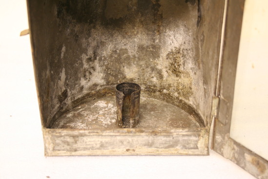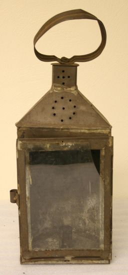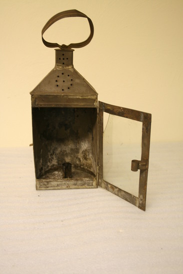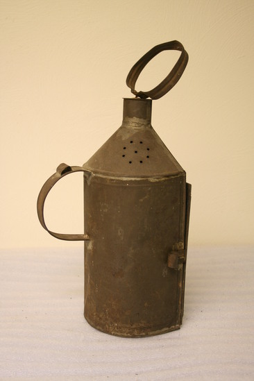 Semi-circular body with flat front. Hinged door with broken glass and curled hinged tin latch. Socket in center of bottom for candle. Semi-circular dome with slanted flat front and cupola effect with flat top and swivel tin loop. Dome and cupola have holes in circles and cross form. Semi-circular flat loop and back for handle.