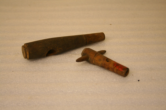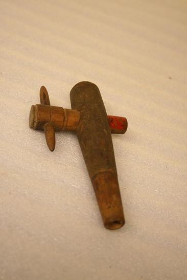 A: Long round piece of wood. Hollow at one end. Hole on top of wood. Piece B fits into hole. B: Tube of wood. Hole at one end, hollow body with hole on top. Thin, round wooden handle at top