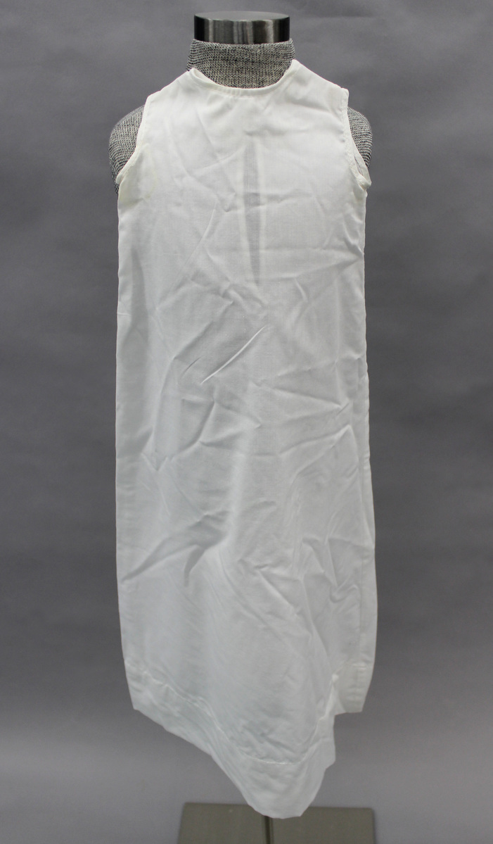 White cotton slip or underdress; A-line; sleeveless; round neck snap at center back; no ornamentation